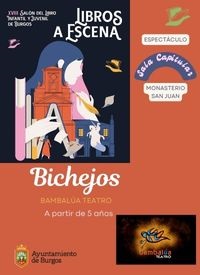 Sábado 3 de enero de 2026. 19:00 h. Domingo 4 de enero de 2026. 12:00 h. TEATRO INFANTIL. Bambalúa Teatro: "Bichejos". Monasterio de San Juan (Sala Capitular). Entrada: 2 € (+ comisión de venta por internet). 60 minutos. A partir de 5 años. Menores acompañados. Programación del Ayuntamiento de Burgos. Una propuesta escénica para disfrutar de las aventuras de unos singulares insectos que nos hablan de tolerancia, miedos y amistad. "Bichejos" es una adaptación del relato del mismo nombre de Francisco Javier Sánchez Serrano, y supone una gran aventura para toda la familia en la que se entremezclan pequeñas historias cotidianas protagonizadas por insectos, pero muy cercanas a la realidad humana. Esta propuesta municipal se enmarca en el núcleo temático del XVIII SALÓN DEL LIBRO INFANTIL Y JUVENIL, ¡LIBROS A ESCENA!, e incluye diferentes actividades de fomento de la creatividad y de animación lectora. Entradas a la venta a partir del miércoles 3 de noviembre internet y en taquillas.